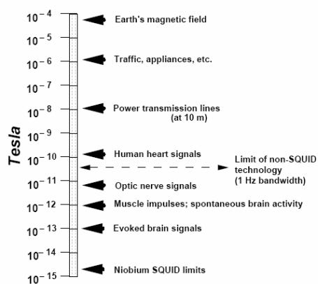 Superconducting Quantum Interference Devices (SQUIDs) are sensitive for up to 5×10−15 T.1